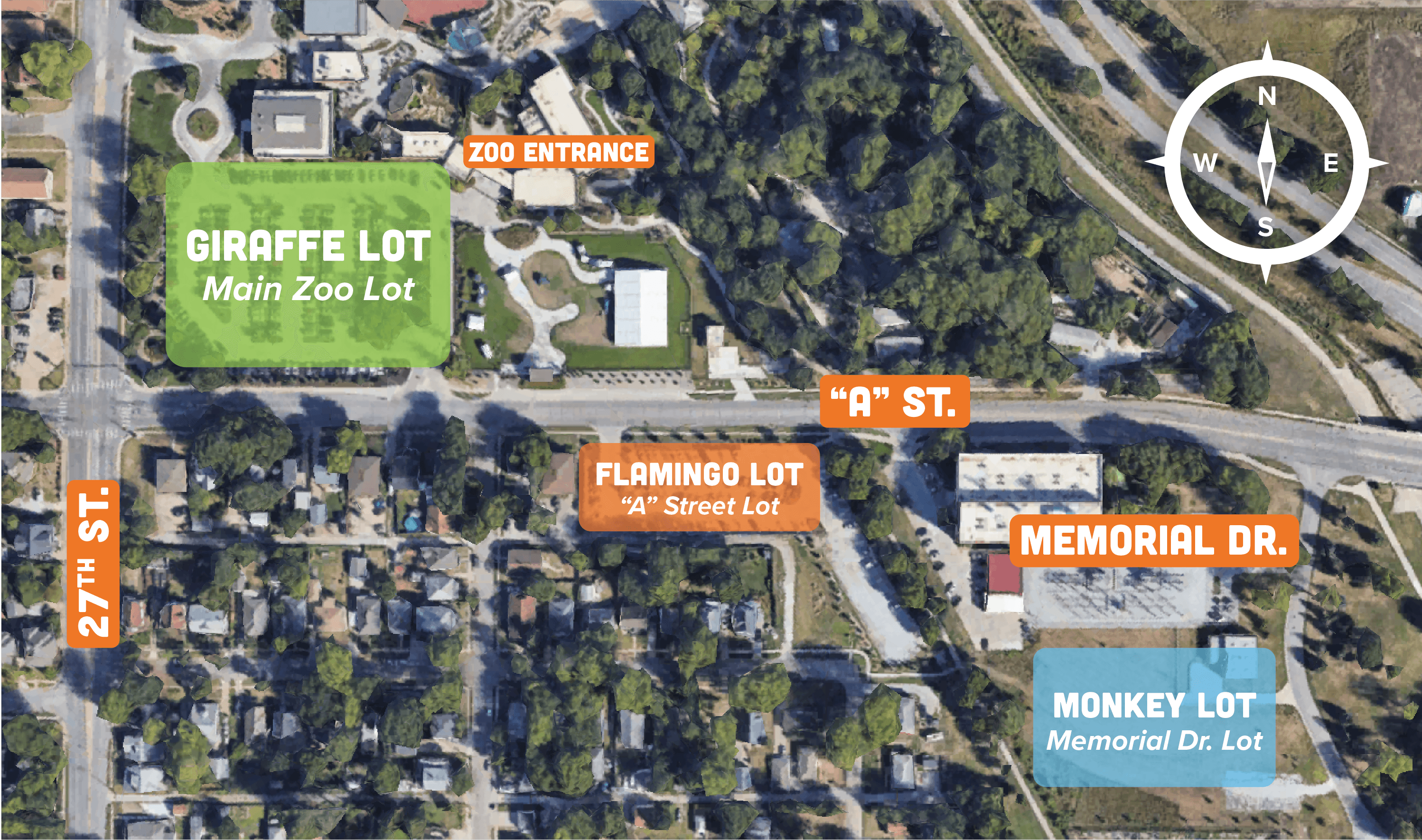 The parking lot entrances are conveniently located off of 27th Street, A Street and Memorial Drive. To enter the Zoo from the additional parking lots, please use the crosswalk and follow the bike path to the Zoo entrance.